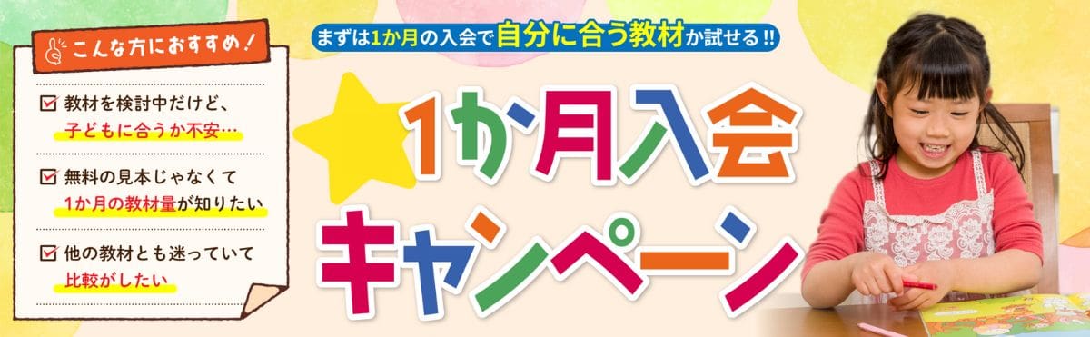 「教材を検討中だけど子どもに合うか不安」「1か月の教材量を知りたい」という方はこの入会キャンペーンがおすすめです。